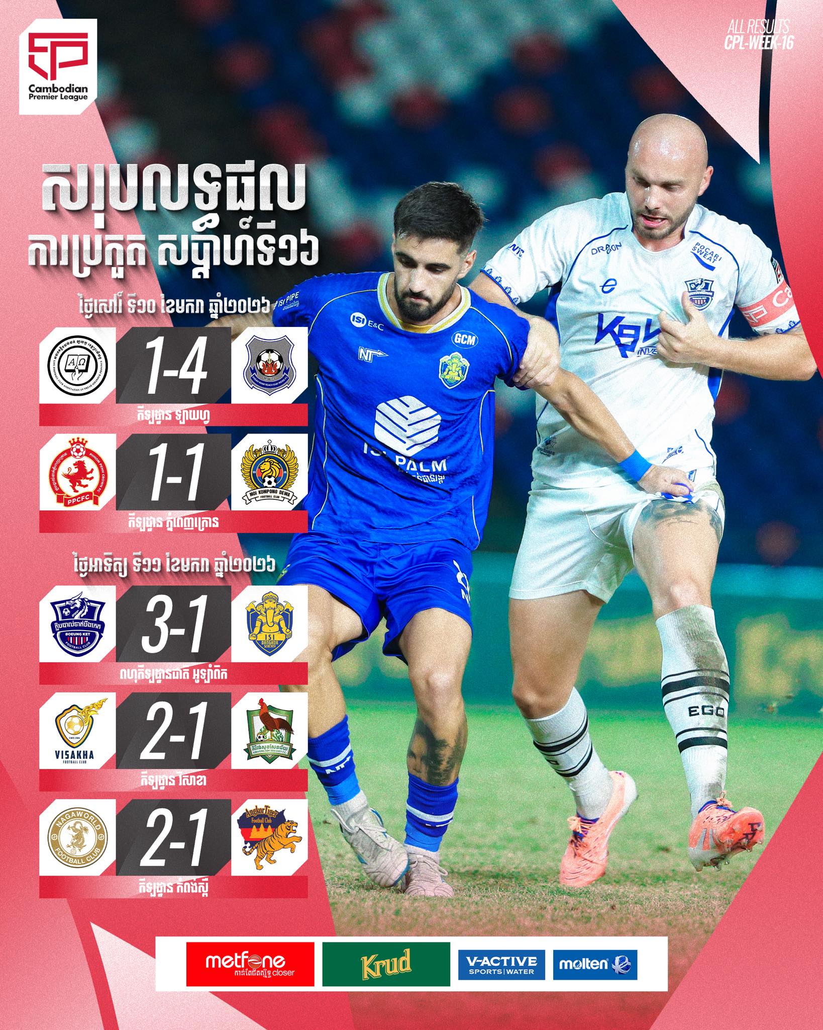 Week 16 of the 2025/26 Cambodian Premier League has concluded with exciting matches and slight changes in the standings, as the top teams continue their strong performances and apply pressure in the race for the championship.
