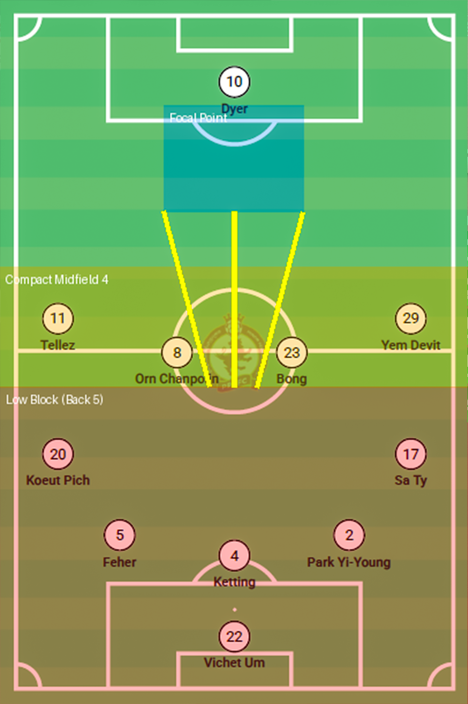ខ្សែការពារ 5 នាក់ រៀបជាប្លុកទាប បិទតំបន់ប្រអប់ និងកាត់ទុកចន្លោះទីតាំងកណ្ដាល ខណៈខ្សែកណ្ដាល 4 នាក់ រៀបជាជួរ ដើម្បីបង្ខំស្វាយរៀងលេងទៅខាង និង cross បាល់ចូលប្រអប់ ហើយនៅខាងមុខ មានខ្សែប្រយុទ្ធតែម្នាក់ ឈរជា focal point សម្រាប់ទទួលបាល់វាយបក និងទាញខ្សែការពារគូប្រកួតចេញពី ទីតាំងរបស់ពួកគេ។ ទម្រង់នេះ ភ្នំពេញក្រោន “ឲ្យគូប្រកួតកាន់កាប់បាល់” ប៉ុន្តែរក្សាទីតាំងលេងឲ្យមានវិន័យខ្ពស់ ហើយរង់ចាំឱកាសវាយបក យកឈ្នះ តែម្តង។