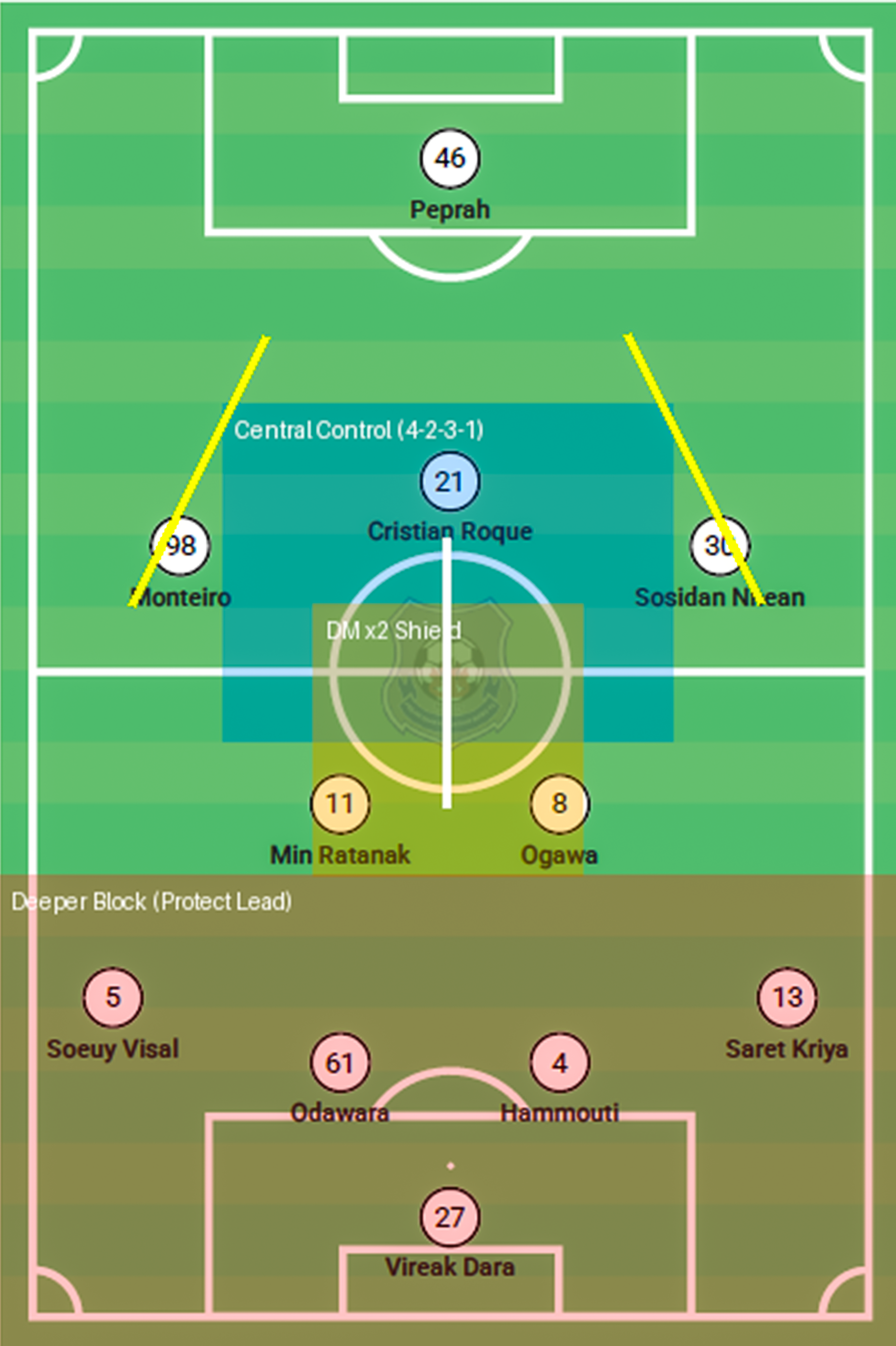 The five-man defense is set in a low block, protecting the penalty area and closing central spaces, while the four midfielders line up compactly to force Svay Rieng to play wide and deliver crosses into the box. Up front, a lone striker acts as the focal point, receiving balls on the counter-attack and pulling opposing defenders out of position. With this structure, Phnom Penh Crown are willing to concede possession but maintain high defensive discipline, patiently waiting for counter-attacking opportunities to secure a result.