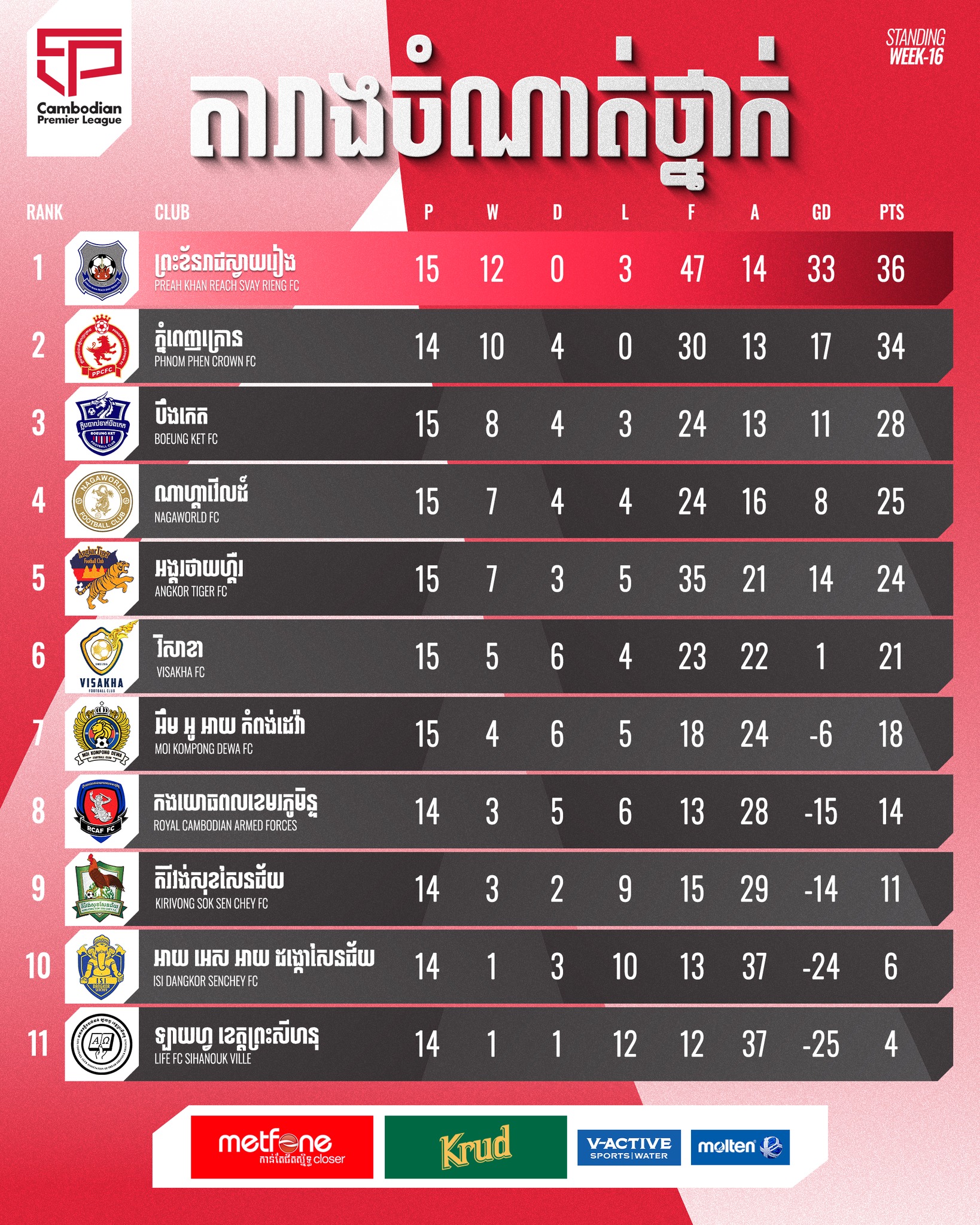 Preah Khan Reach Svay Rieng (PKR) sit at the top of the table with 36 points from 15 matches, while Phnom Penh Crown follows closely with 34 points from 14 matches and remain unbeaten in the 2025/26 season.