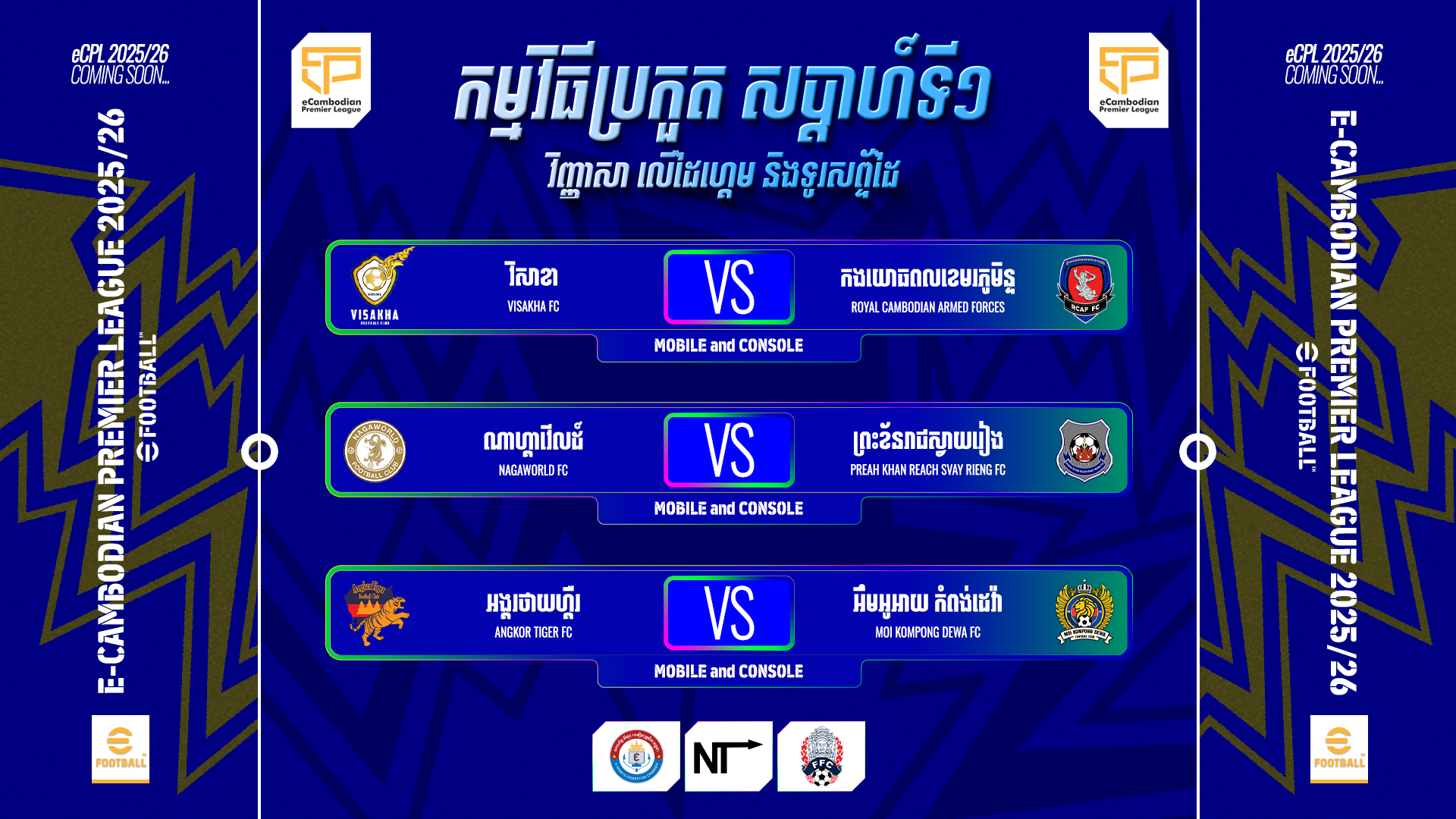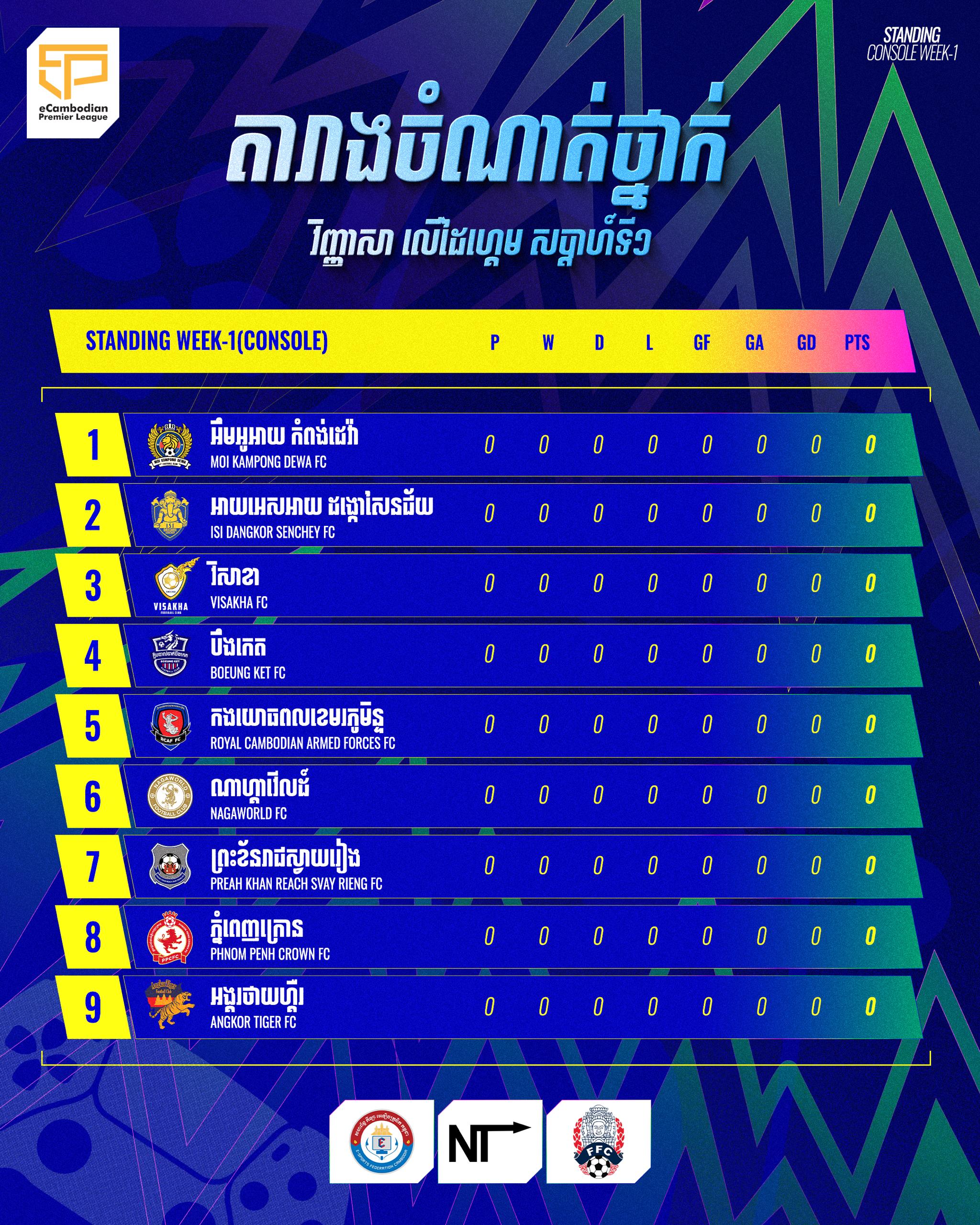 The first teams to face each other are Visakha vs Royal Cambodian Armed Forces (RCAF), Nagaworld vs Preah Khan Reach Svay Rieng, and Angkor Tiger vs MOI Kompong Dewa FC. The matches will start from 5:00 PM until 6:30 PM. The e-Cambodian Premier League will run from November 2025 to February 2026, with a total of 11 weeks plus two-day Play-off round.