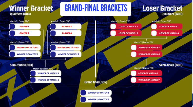 •The top 6 teams with the highest point at the end of the regular season will compete over the course of the Play-off stage, which will follow a double-elimination brackets format. Eligible teams will be eliminated from the Grand Finals after losing two matches. Following the Grand-Finals bracket.