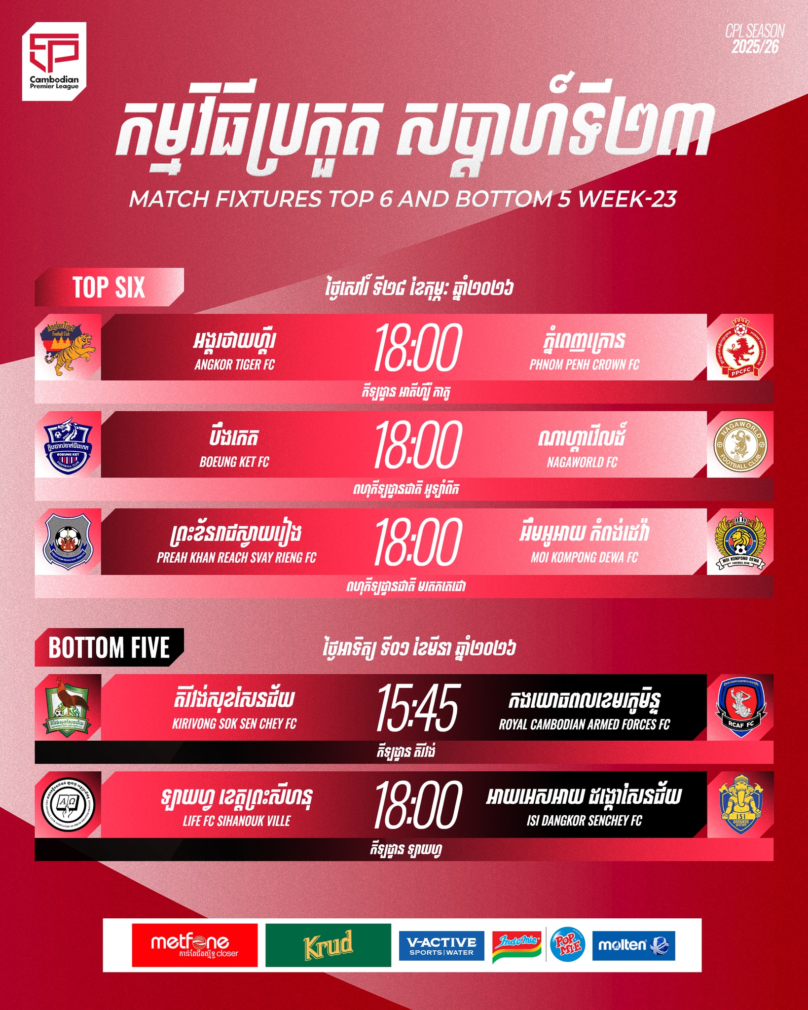 After the completion of week 22, the teams in the Top 6 have been officially confirmed, and the competition for points is becoming increasingly intense as the weekend fixtures of the Cambodian Premier League 2025/26 approach.