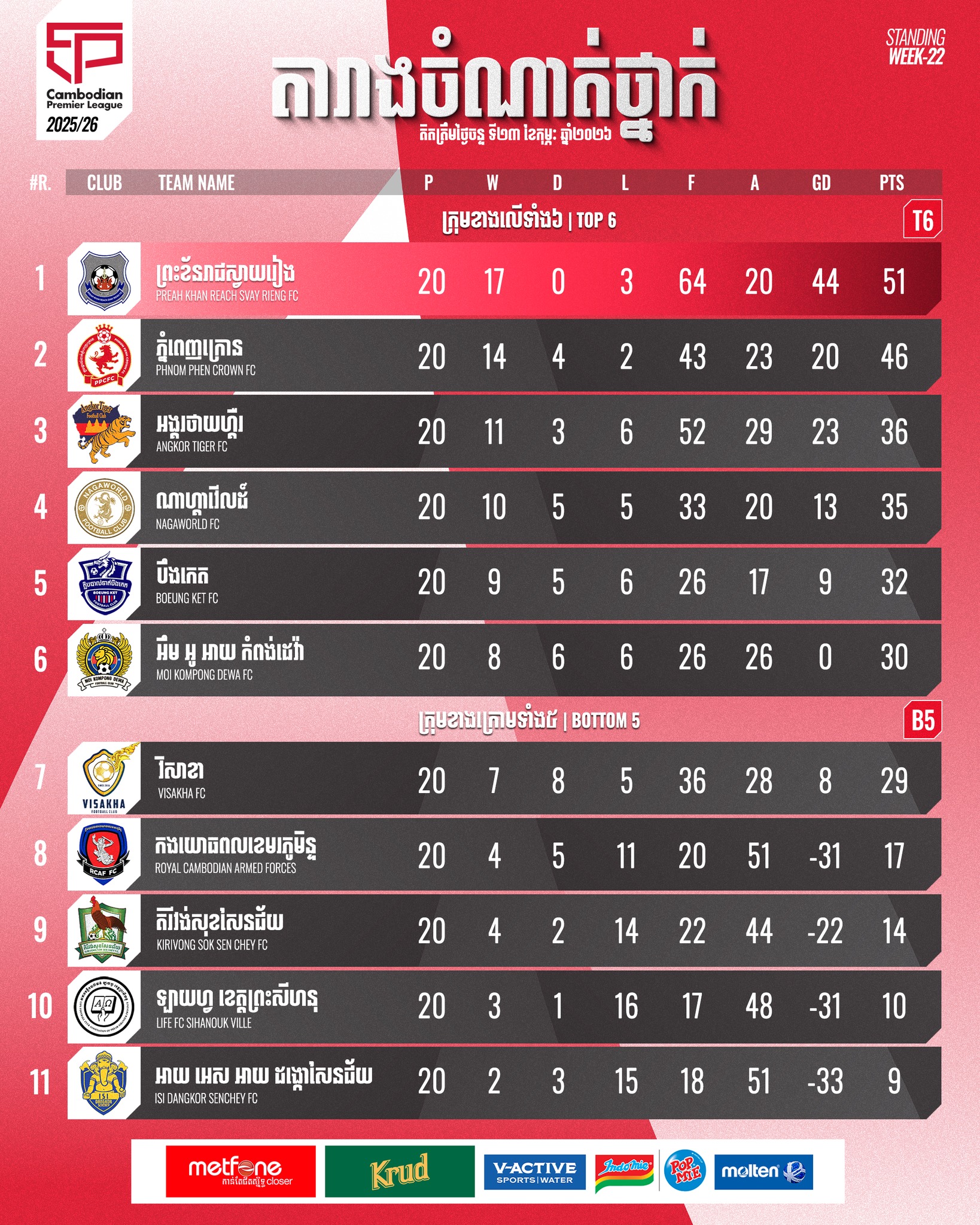ក្រោយបញ្ចប់ការប្រកួត 20 សប្ដាហ៍ ក្រុមក្នុងតំបន់ TOP 6 ត្រូវបានកំណត់ជាផ្លូវការ ហើយការប្រកួតប្រជែងពិន្ទុកំពុងកើតមានយ៉ាងតានតឹង នៅចុងសប្ដាហ៍នៃការប្រកួត ខេមបូឌានព្រីមៀរលីគ ឆ្នាំ២០២៥/២៦ ។