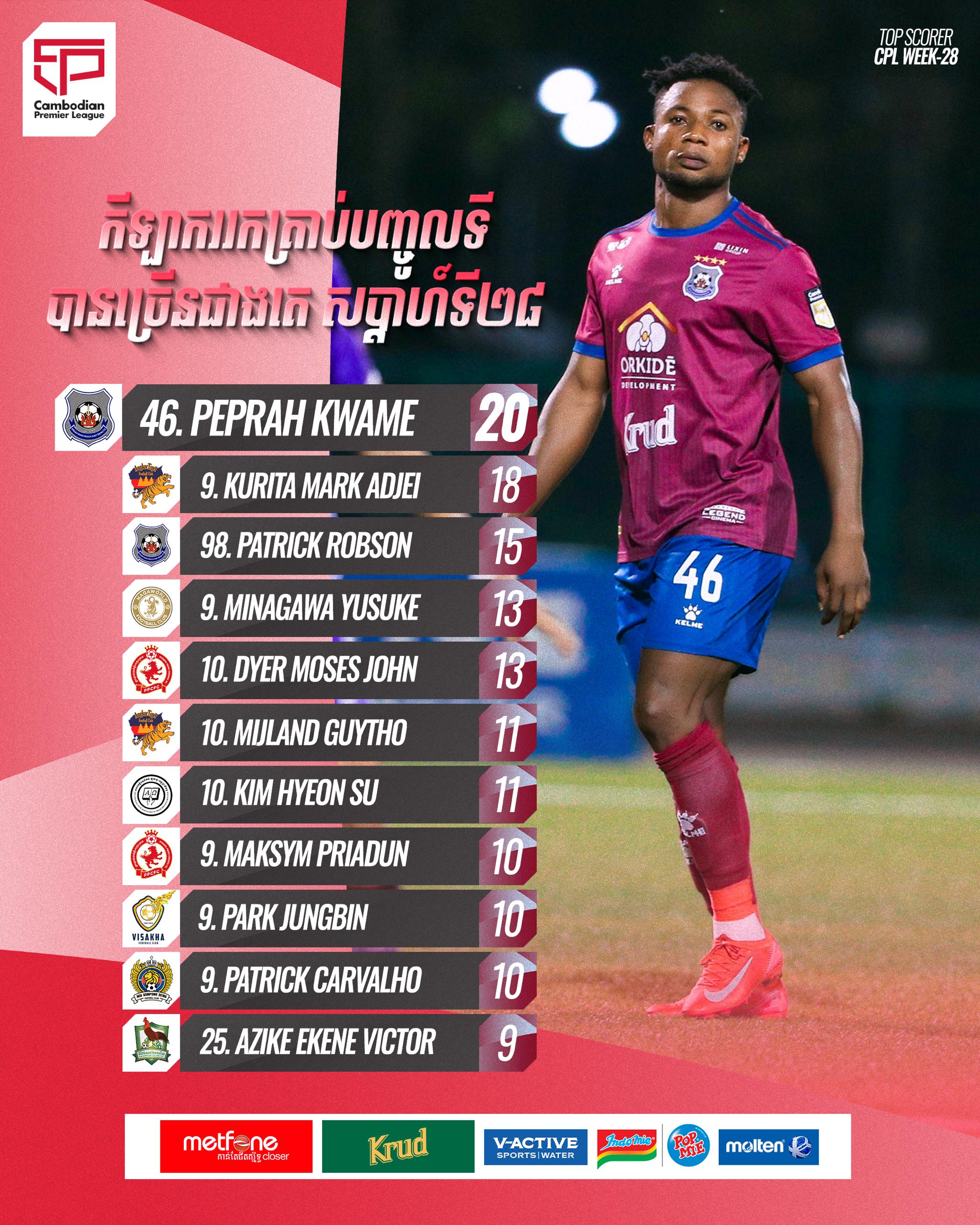 ចុងសប្ដាហ៍នេះ នឹងកាន់តែសំខាន់! តើ Peprah អាចរក្សាតំណែងបានទេ ឬមានការប្រែប្រួល? កុំភ្លេចតាមដានការប្រកួតទាំងអស់ នៃខេមបូឌានព្រីមៀរលីគ នៅលើគេហទំព័រ CPL Plus ដើម្បីដឹងថា តើអ្នកណានឹងក្លាយជា Top Scorer រដូវកាលនេះ!